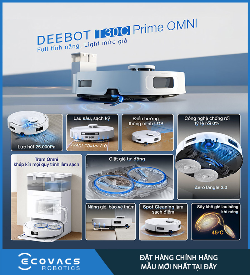 Ecovacs Deebot T30C Prime Omni là mẫu robot hút bụi lau nhà được phát triển theo hướng tự động hóa toàn diện, dành cho những gia đình muốn giảm tối đa thời gian và công sức cho việc dọn dẹp mỗi ngày. Sản phẩm không chỉ gây chú ý nhờ lực hút 25.000Pa, mà còn nổi bật với loạt công nghệ thiên về trải nghiệm thực tế như ZeroTangle 2.0 chống rối, OZMO Turbo 2.0 lau xoay, tự nâng giẻ 9mm, TrueMapping 2.0, TrueDetect 3D và trạm OMNI đa năng.