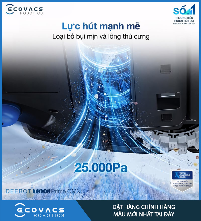 Điểm nổi bật đầu tiên của Ecovacs Deebot T30C Prime Omni là lực hút tối đa 25.000Pa, mức công suất được trang sản phẩm nhấn mạnh như một lợi thế lớn trên cả sàn cứng lẫn thảm. Với mức hút này, robot có thể xử lý tốt bụi mịn, tóc, lông thú, vụn thức ăn và các loại rác nhỏ thường bám trong khe sàn hoặc len vào sợi thảm.
