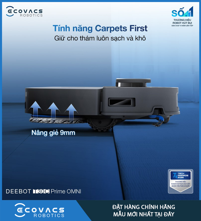 Ecovacs Deebot T30C Prime Omni có khả năng tự động nâng giẻ lau lên 9mm khi gặp thảm, một tính năng rất quan trọng với những không gian sử dụng kết hợp sàn cứng và thảm. Trang sản phẩm cho biết robot còn có chế độ Carpets First, ưu tiên xử lý thảm trước để tránh làm ướt bề mặt.