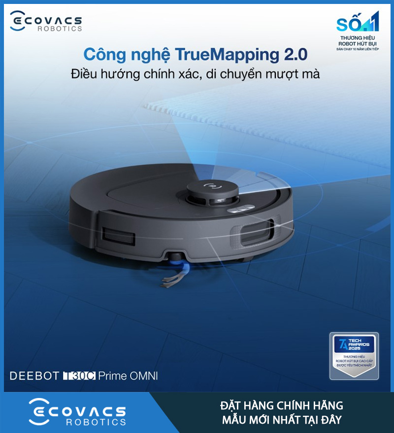 Ecovacs Deebot T30C Prime Omni được trang bị TrueMapping 2.0, công nghệ lập bản đồ giúp robot nhận diện bố cục ngôi nhà nhanh và tối ưu đường đi hiệu quả hơn. Trang sản phẩm nêu rõ đây là một trong những tính năng cốt lõi giúp robot đi có logic, hạn chế lặp lại và giảm bỏ sót khu vực.