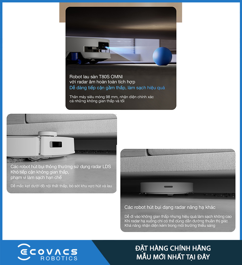 Với độ dày chỉ 98mm, T80S Omni dễ dàng chui vào các khu vực thường bị bỏ quên như gầm giường, gầm sofa, gầm tủ kệ thấp. Đây là lợi thế rất “thực dụng” vì bụi hay tích tụ lâu ngày ở những vị trí này.