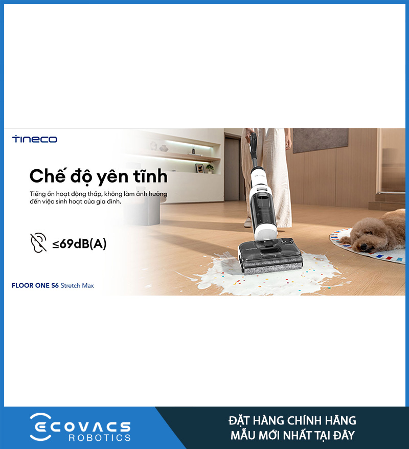Tineco S6 Stretch Max có chế độ Silent Mode – vận hành êm ái dưới 69dB, êm hơn cả tiếng quạt gió, mang lại trải nghiệm làm sạch nhẹ nhàng và tinh tế: