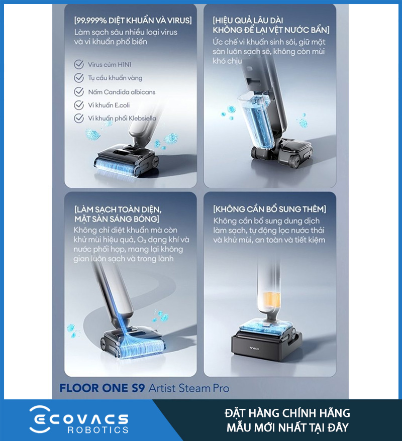 Loại bỏ tới 99.999% vi khuẩn – virus trên sàn nhà mà không cần dùng hóa chất tẩy rửa độc hại.