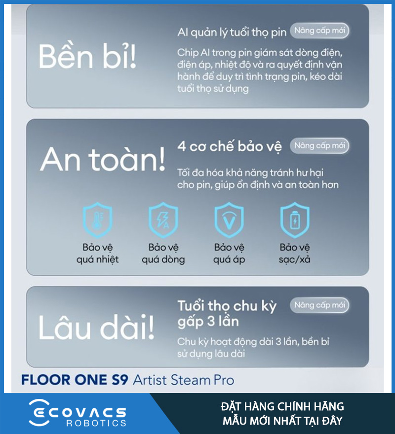 Khác với các dòng máy sử dụng pin lithium-ion thông thường, Tineco S9 Artist Steam Pro được tích hợp pin công nghệ mới với khả năng quản lý nhiệt độ – ổn định điện áp – chống chai pin, giúp máy vận hành an toàn và bền bỉ vượt trội.