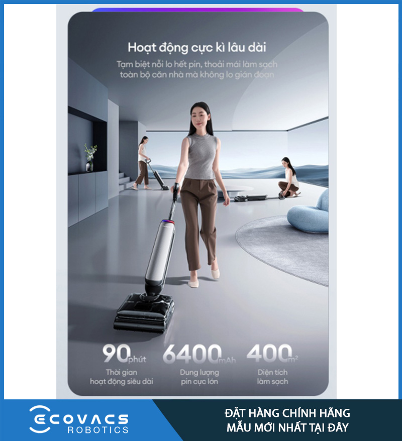 Hút bụi và lau sàn liên tục mà không cần phải ngắt quãng giữa chừng để sạc lại.