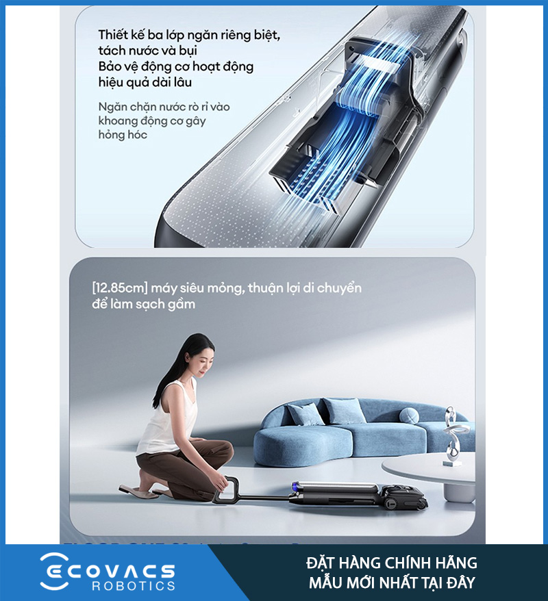 Điểm cộng lớn trong thiết kế là sự tách biệt hoàn toàn giữa các khoang chứa: nước sạch – nước bẩn – bụi rác, giúp hạn chế tái nhiễm vi khuẩn và đảm bảo vệ sinh tối đa trong quá trình sử dụng.