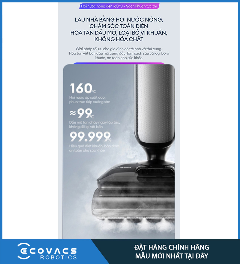 Nhiệt độ hơi nước lên tới 160 độ C, cho phép tiêu diệt tới 99.999% vi khuẩn, vi nấm và các mầm bệnh bám dưới sàn nhà.