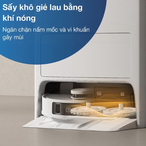 - Tự động giặt và sấy khô khăn lau: Trạm sạc OMNI được trang bị hệ thống tự động giặt và sấy khô khăn lau. Sau khi hoàn tất việc lau nhà, robot sẽ tự động quay về trạm sạc, giặt sạch khăn lau bằng nước sạch và sấy khô bằng khí nóng. Nhờ vậy, bạn không cần tốn thời gian giặt giũ khăn lau thủ công.